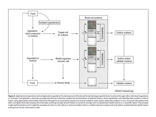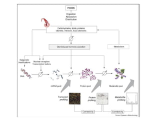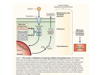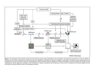Nutrigenomics attempts to study how nutrition influences gene expression and metabolic pathways. It examines the dietary signatures - patterns of gene, protein, and metabolite expression - produced in cells and tissues in response to specific nutrients. Nutrigenomics seeks to understand how these signatures impact homeostasis and may help identify early biomarkers for conditions like insulin resistance. It takes a holistic approach using omics technologies like transcriptomics, proteomics, and metabolomics. Nutrigenomics also examines how genetics and environment interact to influence nutritional needs and responses.