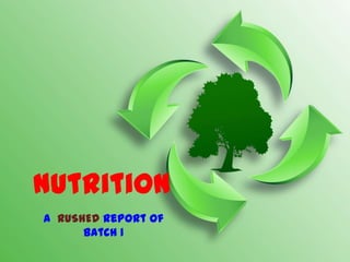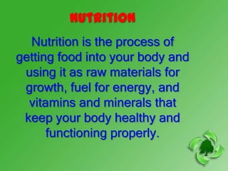Nutrition is the process of consuming foods and using their nutrients for growth, energy, and overall health and functioning. Nutrients include macronutrients like proteins, carbohydrates, and fats which are needed in large quantities, as well as micronutrients like vitamins and minerals which are needed in smaller amounts. The major nutrients that provide nourishment are carbohydrates, fats, proteins, fiber, soy, and fruits and vegetables. Carbohydrates provide glucose for energy, proteins provide amino acids to build and repair the body, and fats surround and insulate cells and are needed for brain and hormone functions. Vitamins and minerals also help chemical reactions in the body and should be obtained through a balanced