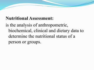 Nutritional assessment involves analyzing anthropometric, biochemical, clinical and dietary data to determine a person's nutritional status. It aims to assess nutritional status, identify body nutrient needs, and recognize health issues related to nutrition. The assessment consists of gathering dietary history, conducting a physical exam, and reviewing laboratory tests. The physical exam includes anthropometric measurements like height, weight and BMI. Laboratory tests examine albumin, hemoglobin and other biochemical indicators. Comparing well-nourished and malnourished individuals identifies key differences in physical and mental characteristics.