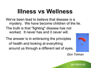 The document discusses the relationship between nutrition, health, and disease. It argues that an industrial food system has led to depleted soils and nutrition-poor foods. As a result, most doctor visits are now related to diet, and obesity, cancer, diabetes, and other illnesses are widespread. It promotes focusing on whole, nutrient-rich foods and a balanced diet for optimal health and wellness.