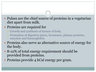Pulses are an important source of protein in vegetarian diets, providing essential amino acids that cereals and grains lack. Proteins are needed for growth, tissue synthesis, digestive juices, hormones, and more. Pulses also provide energy and fiber. While protein quality varies, pulses have a net protein utilization of around 65 compared to egg protein. A table lists the nutrient contents of various pulses commonly consumed in India, such as Bengal gram, black gram, cowpea, and soybean. Pulses additionally contain vitamins and folic acid.