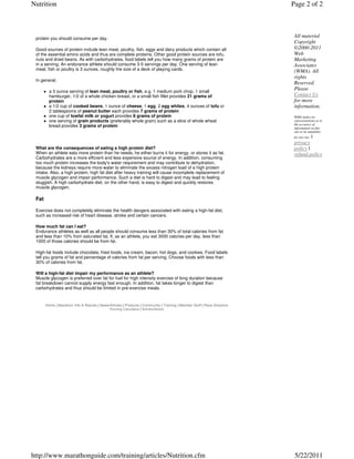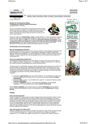 The document discusses nutrition guidelines for endurance athletes like marathon runners. It recommends that their diet consist of 60-70% carbohydrates, 12-15% protein, and less than 30% fat. Carbohydrates are the most important macronutrient as they replenish glycogen stores and fuel exercise. Endurance athletes should aim to consume the number of grams of carbohydrates equal to their weight in kilograms multiplied by 7 or pounds multiplied by 3.2. Protein aids in muscle repair and growth, with athletes needing 12-15% of calories from protein or 1.3 grams of protein per kilogram or 0.6 grams per pound of weight. Fat intake should be under 30% of
