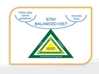This document discusses the importance of a balanced diet and proper nutrition. It defines a balanced diet as one containing foods from all main food groups in correct proportions according to one's age, body size, sex, occupation, health status and climate. A balanced diet provides vital functions, supports growth and repair of cells, and ensures sufficient energy. It recommends drinking water, minimizing sugar intake, eating regular meals and planning meals with moderate portions of proteins, healthy fats and carbohydrates, fruits and vegetables. The document also discusses being sensitive of others' religious beliefs regarding food.
