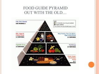 The document discusses the USDA's food guide pyramid and recommendations for nutrition and physical activity. It provides details on the six main food groups: grains, vegetables, fruits, dairy, proteins, and oils. It explains what foods are included in each group and recommends choosing whole grains, a variety of fruits and vegetables, low-fat dairy, and healthy proteins like fish and nuts. The document also recommends at least 30 minutes per day of moderate or vigorous physical activity to maintain good health.