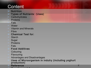 The document discusses various topics related to nutrition including the different types of nutrients, chemical tests to identify nutrients, food additives, and uses of microorganisms in industry. It defines nutrition and explains there are 7 main types of nutrients: carbohydrates, proteins, fats, vitamins, minerals, fiber, and water. It provides details on each nutrient including their chemical composition, roles in the body, and examples of chemical tests to identify them. The document also discusses food additives like coloring and flavoring, and covers advantages and disadvantages. Finally, it discusses uses of microorganisms in industry such as using bacteria to produce yogurt through fermentation.