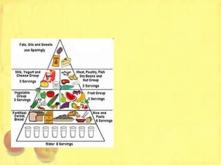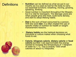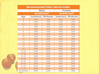 The document discusses nutrition, diet, dietary habits, calories, and maintaining a balanced diet. It provides definitions of key terms and explains the different food groups and nutrients the body needs, including carbohydrates, proteins, fats, vitamins, minerals, water and fiber. It discusses how to calculate caloric needs and balance based on factors like age, gender and physical activity levels. It also addresses topics like body composition, obesity, anorexia, and how diet and exercise relate to weight management and sports performance.