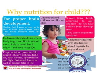 This document discusses the importance of child nutrition. It notes that proper nutrition is important for children's growth and development and to establish healthy eating habits. A balanced diet with fruits, vegetables, whole grains, protein foods and dairy helps children get essential nutrients and maintain good health. The document provides daily serving guidelines for different age groups and notes foods that are important sources of key nutrients like protein, vitamins and minerals. It emphasizes limiting added sugars, saturated and trans fats, and sodium. Healthy eating supports children's academic performance and brain development.