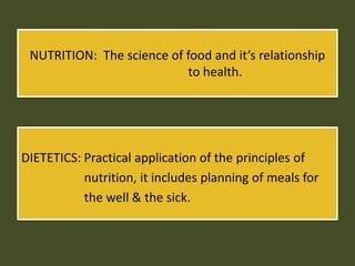 This document discusses nutrition, dietetics, and protein. It defines nutrition as the science of food and its relationship to health. Dietetics is defined as the practical application of nutritional principles, including meal planning for healthy and sick individuals. The document then classifies foods by origin (animal or vegetable), chemical composition (proteins, fats, carbohydrates, vitamins, minerals), and predominant function (body building, energy giving, protective). Several pages are devoted to discussing protein in detail, including essential and non-essential amino acids, sources of protein, and assessing the nutritive value of proteins. The protein requirement for different groups is also outlined.