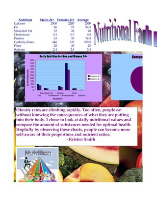 This document compares daily nutritional values for males and females aged 24 and older. It shows the recommended daily amounts of calories, fat, saturated fat, cholesterol, protein, carbohydrates, fiber and sodium. It also includes two charts, one comparing the average daily values and another showing obesity rates are climbing as many people eat without understanding the nutritional consequences of their food. The author analyzed this data to help people become more aware of their nutrient proportions and ratios for optimal health.
