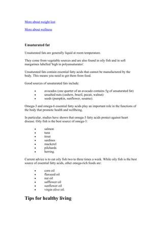 Fat is essential for the body but excessive amounts can be harmful. There are two main types - saturated and unsaturated. Saturated fat raises cholesterol and risk of disease while unsaturated fat is generally healthier. The document provides tips to reduce saturated fat intake through choices like using vegetable oils instead of butter, eating fish instead of meat, and selecting low-fat dairy.