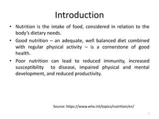 The document discusses the significance of nutrition, outlining its role in health and the consequences of poor nutrition, including various forms of malnutrition. It highlights global and national trends in nutrition, historical initiatives in Nepal, and the Sustainable Development Goals related to nutrition intervention. The national response to malnutrition in Nepal involves comprehensive programs aimed at reducing child and maternal mortality through improved nutritional strategies.