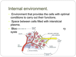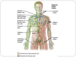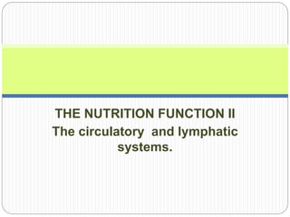 The circulatory and lymphatic systems work together to transport nutrients, oxygen, hormones, carbon dioxide, and waste throughout the body. The circulatory system is composed of the heart, arteries, veins, and capillaries. Blood is pumped from the heart through arteries and returns via veins, exchanging materials with tissues through capillaries. The lymphatic system drains excess fluid from tissues, transports it via lymph vessels, and returns it to the blood. Together these systems maintain homeostasis by circulating nutrients, gases, hormones, and waste products to and from cells, while also fighting pathogens and regulating fluid balance.