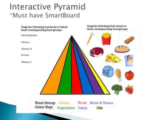 The document discusses nutrition and healthy eating. It outlines the five main food groups - vegetables, grains, fruits, dairy, and protein foods. Eating a variety of foods from each group provides vitamins, minerals and other important nutrients for health. It also emphasizes the importance of physical activity for overall well-being. Key recommendations include eating whole grains, incorporating fruits and vegetables daily, and choosing lean protein sources.