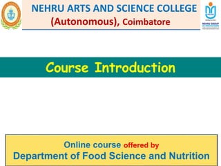 This document outlines an online course offered by the Department of Food Science and Nutrition at NEHRU ARTS AND SCIENCE COLLEGE in Coimbatore, India. The course covers topics like nutritional composition of food groups, nutrient needs for different age groups, methods for planning menus, food processing techniques to minimize nutrient loss, making healthy food choices, evaluating current eating and physical activity habits, and how to maintain a healthy lifestyle when life gets busy. The course aims to help students understand what constitutes a healthy diet and lifestyle and how to modify their habits to prevent health issues.