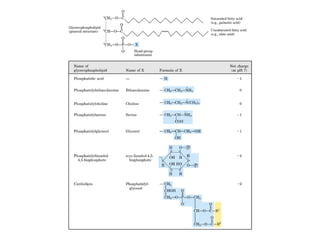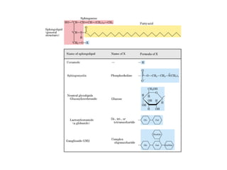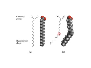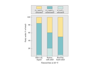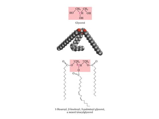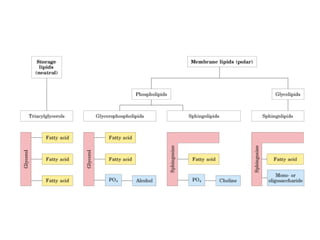 Lipids can be categorized as either storage lipids or structural lipids. Storage lipids, like triglycerides, are used primarily to store energy and can be solid fats or liquid oils depending on their carbon chain length and saturation. Structural lipids, including phospholipids and glycolipids, provide structure for cell membranes and tissues. Phospholipids are the major structural lipid and can self-assemble into bilayers, micelles, or vesicles in water, forming the basic structure of cell membranes.