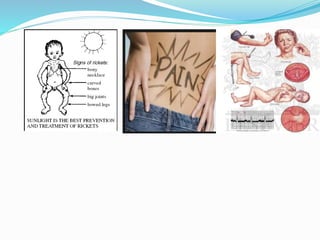 Nutritional deficiency disorders in humans can be caused by inadequate intake, excess intake, malabsorption, or disease. There are several major types of deficiencies including mineral deficiencies like calcium, phosphorus, and iron; vitamin deficiencies like Vitamins A and B; and deficiencies in proteins and lipids. Common symptoms of deficiencies include fatigue, weakness, pale skin, irritability, and increased risk of diseases like rickets, osteoporosis, and anemia. Treatments involve consuming nutrient-rich foods and supplements to improve intake of the deficient nutrient.
