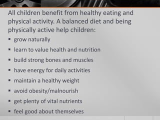 - Texture modifications like pureed or blended foods for children with chewing/swallowing difficulties from conditions like cerebral palsy.
