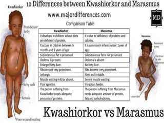 - Protein-energy malnutrition (PEM) which includes conditions like kwashiorkor and marasmus caused by inadequate protein and calorie intake.