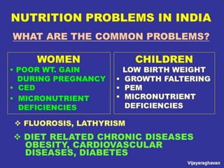 The document discusses various nutritional problems including undernutrition and overnutrition. It defines undernutrition as a deficiency of essential nutrients and lists several types: