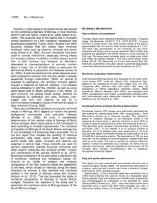 The document analyzes the nutritional composition of Moringa oleifera leaves from South Africa. It finds the leaves contain high levels of protein (30.3%), various minerals including calcium (3.65%), phosphorus (0.3%), and micronutrients like iron (490 mg/kg). Seventeen fatty acids were identified with alpha-linolenic acid being highest (44.57%). Vitamin E content was also high at 77 mg/100g. Overall, the amino acids, fatty acids, minerals, and vitamin profiles indicate Moringa leaves can provide a desirable nutritional balance.