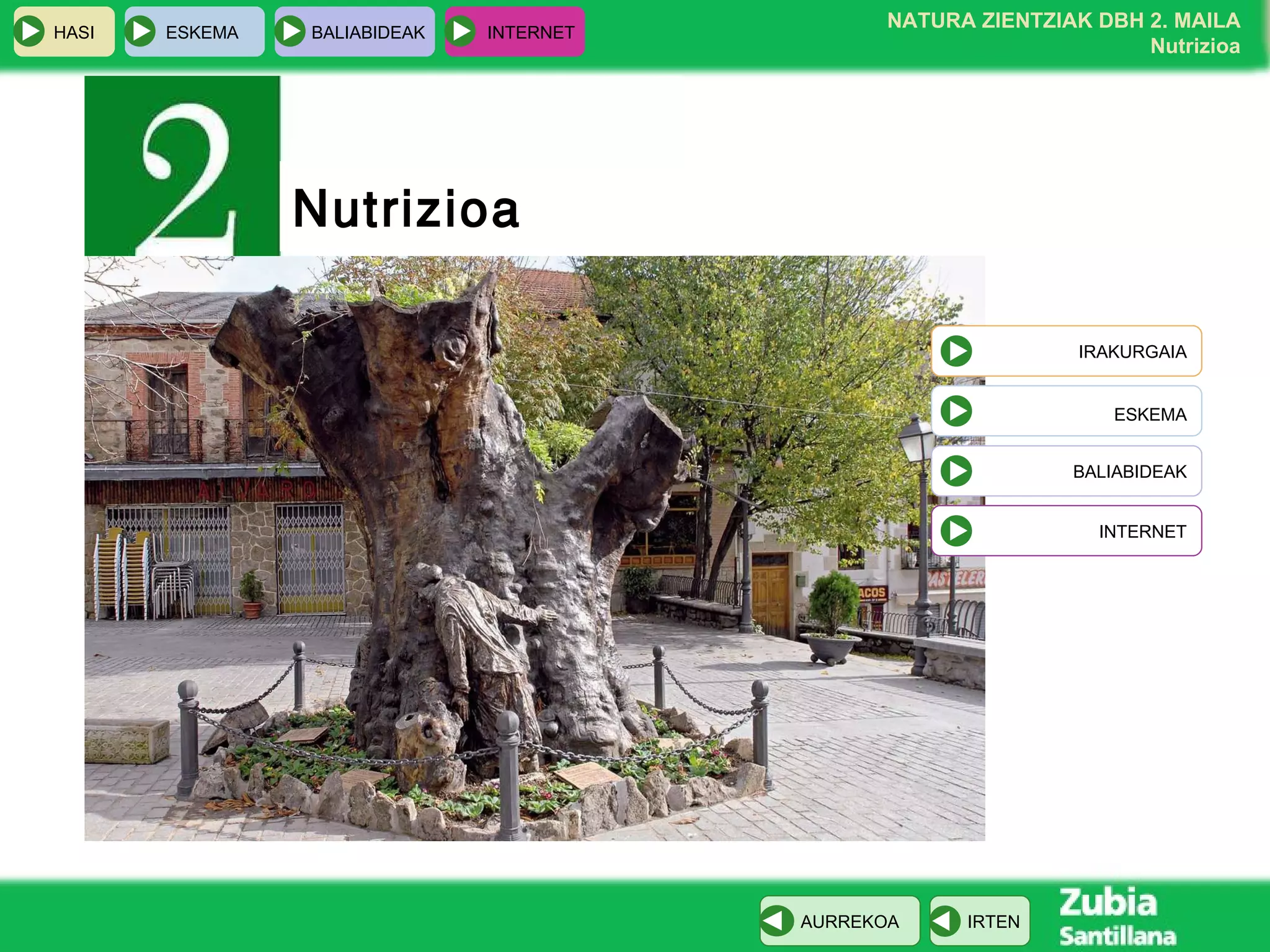 Edukien eskema NutrizioaEzaugarriak Digestioa Faseak Motak Digestio-prozesuak Arnasketa Ezaugarriak Gas trukaketa Motak Substantzien garraioa Ezaugarriak Zirkulazio-aparatuak Iraizpena Ezaugarriak Iraizpen-aparatuak Animalia-nutrizioa Landare-nutrizioa Ezaugarriak Elikagai xurgapena Garraioa Gas trukaketa Fotosintesia Metabolismoa I raizpena HASIERA