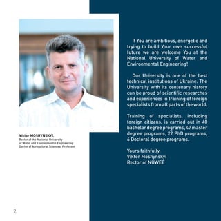 The document is a university profile for the National University of Water and Environmental Engineering (NUWEE) in Ukraine for 2017/2018. It provides information about NUWEE such as its history, degree programs offered, research areas, campus facilities, international students, and contact details. NUWEE is one of the leading technical universities in Ukraine, established in 1915, that offers degrees from bachelor's to doctoral levels in various fields including water management, engineering, agriculture, law, and economics.