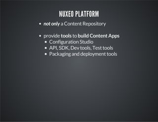 The Nuxeo platform is evolving with upcoming releases focused on enhancing its API and building modern content applications. Key improvements include a dynamic HTTP API, customizable services, and a composable structure that allows for smoother data interactions and automation chains. Future developments aim to streamline client side operations and extend support for cloud integration and various programming environments.