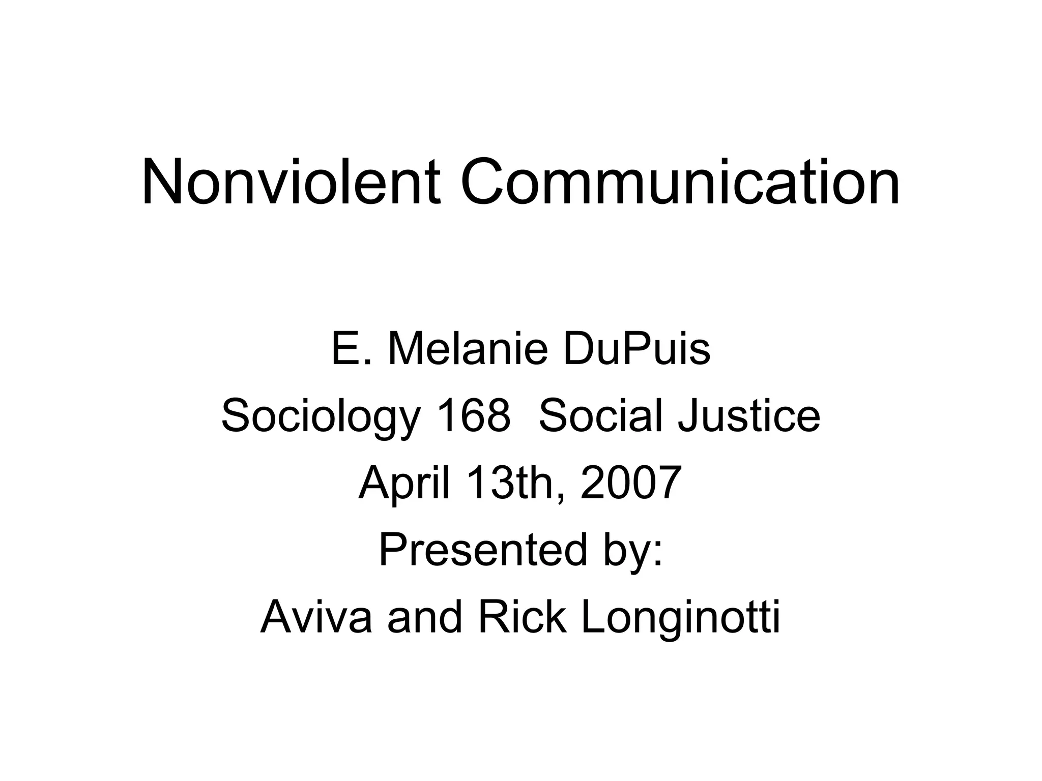 The document provides an overview of a presentation on Nonviolent Communication (NVC). It discusses key concepts of NVC including understanding universal human needs and focusing on empathetic listening. It also provides examples of role-plays that demonstrate the steps of NVC, from internal self-empathy to expressing observations, feelings and needs and making requests. The presentation aims to help students understand and practice the principles of NVC.