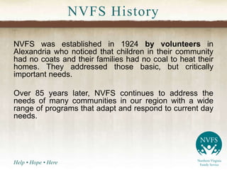 NVFS was established in 1924 by volunteers who provided coats and coal to children in need. Today, over 95 years later, NVFS addresses the needs of communities through various programs and over 1,500 volunteers who donate over 53,000 hours annually. NVFS serves nearly 33,000 clients each year, 60% of whom make less than $20,000, through five key initiatives including child and youth services, emergency assistance, housing, workforce development, and health access.