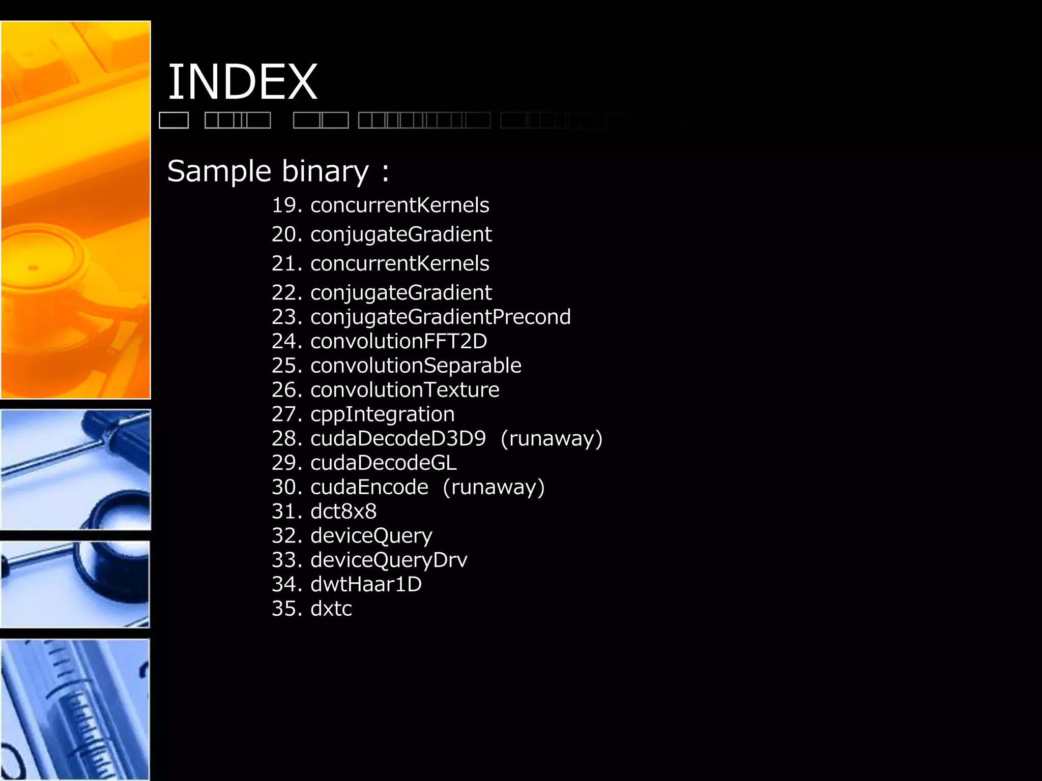 This document provides performance results for various CUDA samples programs using an NVIDIA GeForce GTX 560 Ti GPU. It tests programs for concurrent kernels, conjugate gradient, convolution using FFTs, separable convolution, CUDA integration with C++ and decoding video to OpenGL and DirectX. Frame rates for video decoding ranged from 723-1031 fps. Convolution tests showed throughput of up to 1588 MPix/s. Conjugate gradient achieved convergence within 8 iterations.