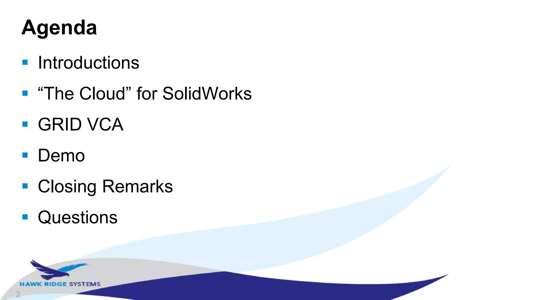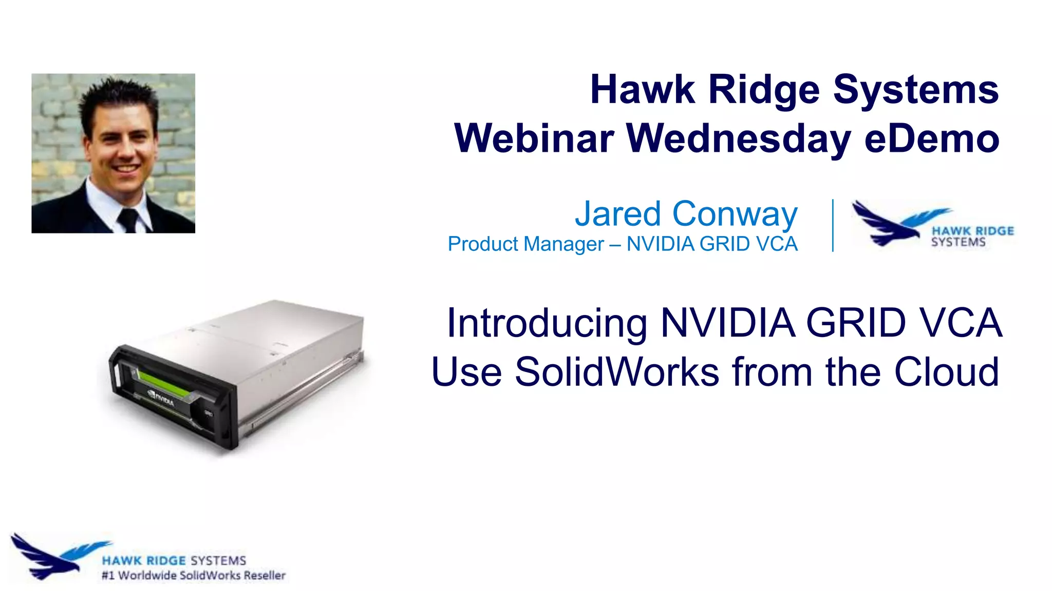 The document outlines a webinar presentation by Jared Conway on using NVIDIA GRID VCA to access SolidWorks from the cloud, emphasizing the advantages of cloud computing such as flexibility, efficiency, and consolidated resources. It includes details about GPU acceleration, workspace architecture, and concludes with recommendations for maximizing hardware and software usage for SolidWorks. Contact information for product and technical inquiries is also provided.