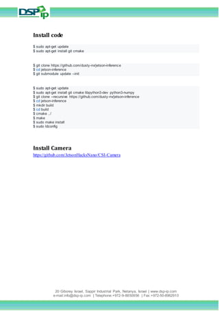 The document provides instructions for setting up an Nvidia Jetson Nano for video processing. It lists the required components which include a 32GB SD card, 5V 4A power supply, WiFi dongle, and Bluetooth keyboard and mouse. It also provides commands to download the disk image and install code for vision processing through git cloning repositories and using cmake to compile libraries.