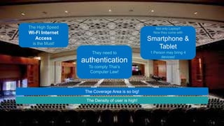 This document discusses WiFi network solutions for convention centers, hotels, and other large venues. It addresses challenges in providing coverage for a large number of users and devices across a wide area while maintaining quality of service. It promotes the iBSG3.5 authentication, billing and monitoring system to manage access and traffic, along with dual-band EnGenius access points and FiberHome switches to provide reliable connectivity. Configuration tips are provided to optimize performance such as defining optimal access point placement and numbers, enabling 5GHz bands, and applying session and speed limits.