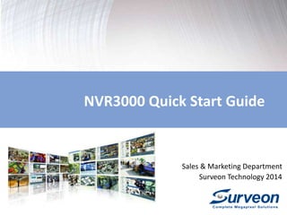 This document provides instructions for using the NVR3000 video management system. It describes the client interface, including live view/playback selection tabs, camera list, snapshot button, volume control, PTZ controls, logs, alarms, details, and main view area. It also explains how to check events and storage status, utilize PAP view, switch to fisheye view, set up motion recording, add third-party cameras, play video back by date or event, configure network and user accounts, and use dual monitors.