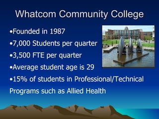 This document summarizes e-learning strategies for allied health programs at Whatcom Community College. It discusses the history and challenges of Whatcom's physical therapy assistant hybrid program. It outlines the e-learning coordinator's goals of providing faculty support and increasing online and hybrid offerings. Specific strategies implemented include developing multimedia resources for online courses, training faculty in online teaching best practices, and continuing to expand lab skills videos and hybrid course offerings. The goal is to improve the student experience and increase access to allied health programs through online and hybrid learning.