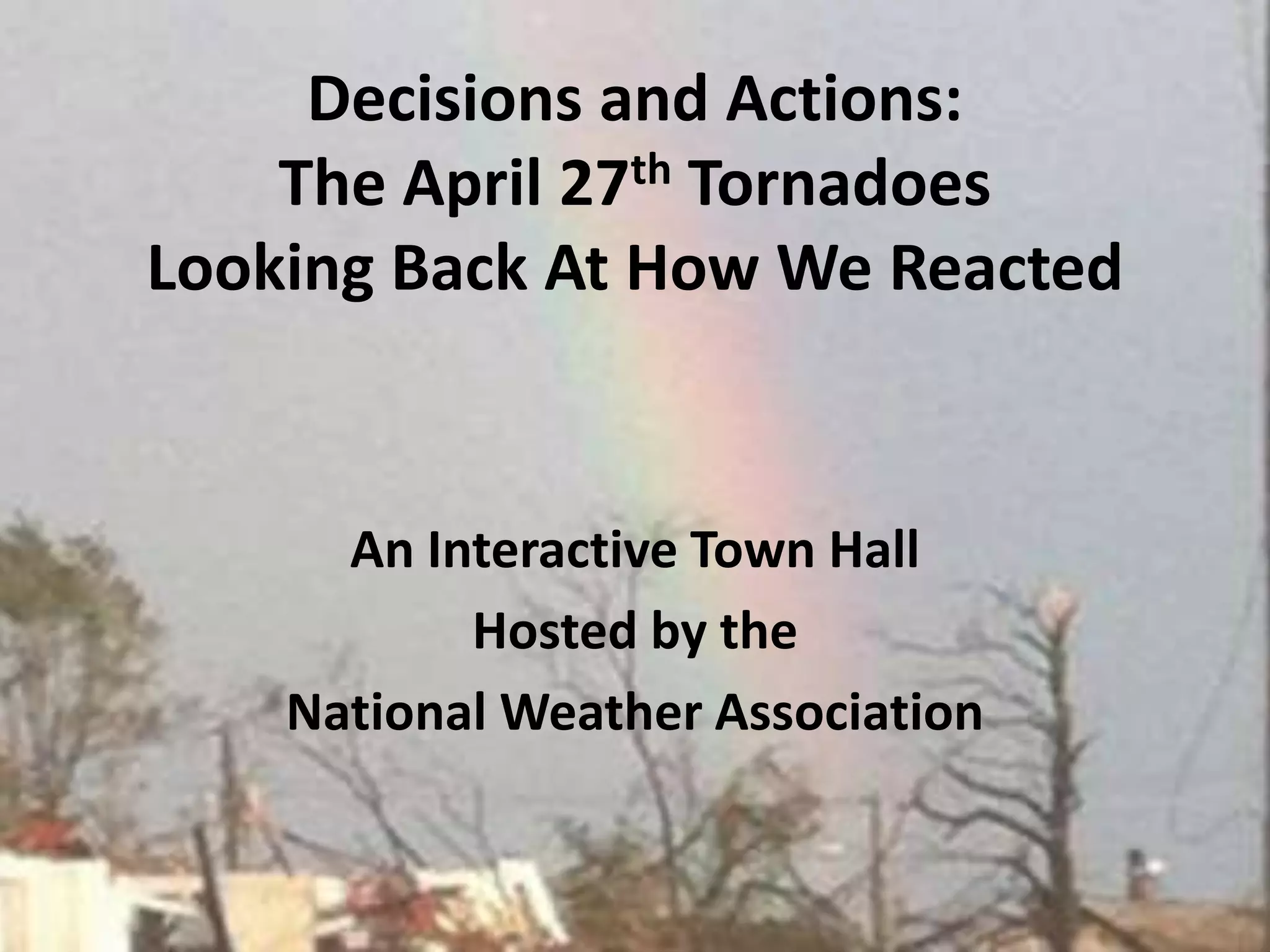 This document summarizes a town hall discussion hosted by the National Weather Association about decisions and actions taken during the April 27, 2011 tornado outbreak in Alabama. The town hall included a panel of weather and emergency experts as well as members of the public affected by the storms. Participants discussed how they received and interpreted warnings, their experiences sheltering from the tornadoes, and ideas for improving the warning system in the future.