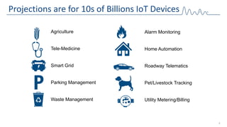 The document discusses Low Power Wide Area Networks (LPWAN) and long range radio modem devices to connect billions of Internet of Things (IoT) devices for applications like agriculture, telemedicine, smart grids, and more. It outlines challenges with existing connectivity options and how LPWAN technologies like those offered by Nwave can provide ultra low-cost, long range connectivity for battery-powered devices. Nwave offers base stations, wireless modems, radio modules, and an IoT management platform to enable scalable, interoperable LPWAN networks.