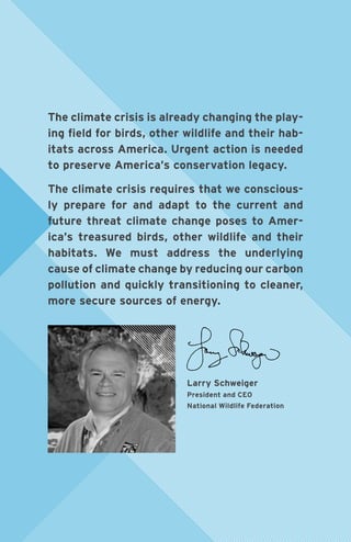 This document discusses how climate change is negatively impacting birds in the United States. Migratory birds face unique challenges as climate change affects the habitats they rely on for breeding, migrating, and overwintering. Bird ranges and habitats are shifting locations in response to warming temperatures. Extreme weather events, diseases, and pest outbreaks exacerbated by climate change are also dramatically altering important bird habitats. Reducing carbon pollution is necessary to limit the magnitude of climate change's impacts and help safeguard birds.