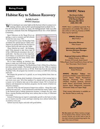 The Northwest Indian Fisheries Commission (NWIFC) discusses progress in salmon recovery efforts, noting the successful harvests by the Stillaguamish and Puyallup tribes for the first time in decades, while emphasizing the urgent need for habitat restoration due to ongoing habitat destruction. The document highlights various activities, such as shellfish closures due to human waste and efforts to track freshwater mussel populations, indicating the interconnectedness of these initiatives for ecosystem health. Lastly, it mentions the Lummi Nation's extensive survey of tideland species, crucial for disaster preparedness, and the Quileute Tribe's intervention to save coho salmon at the Sol Duc hatchery from state budget cuts.