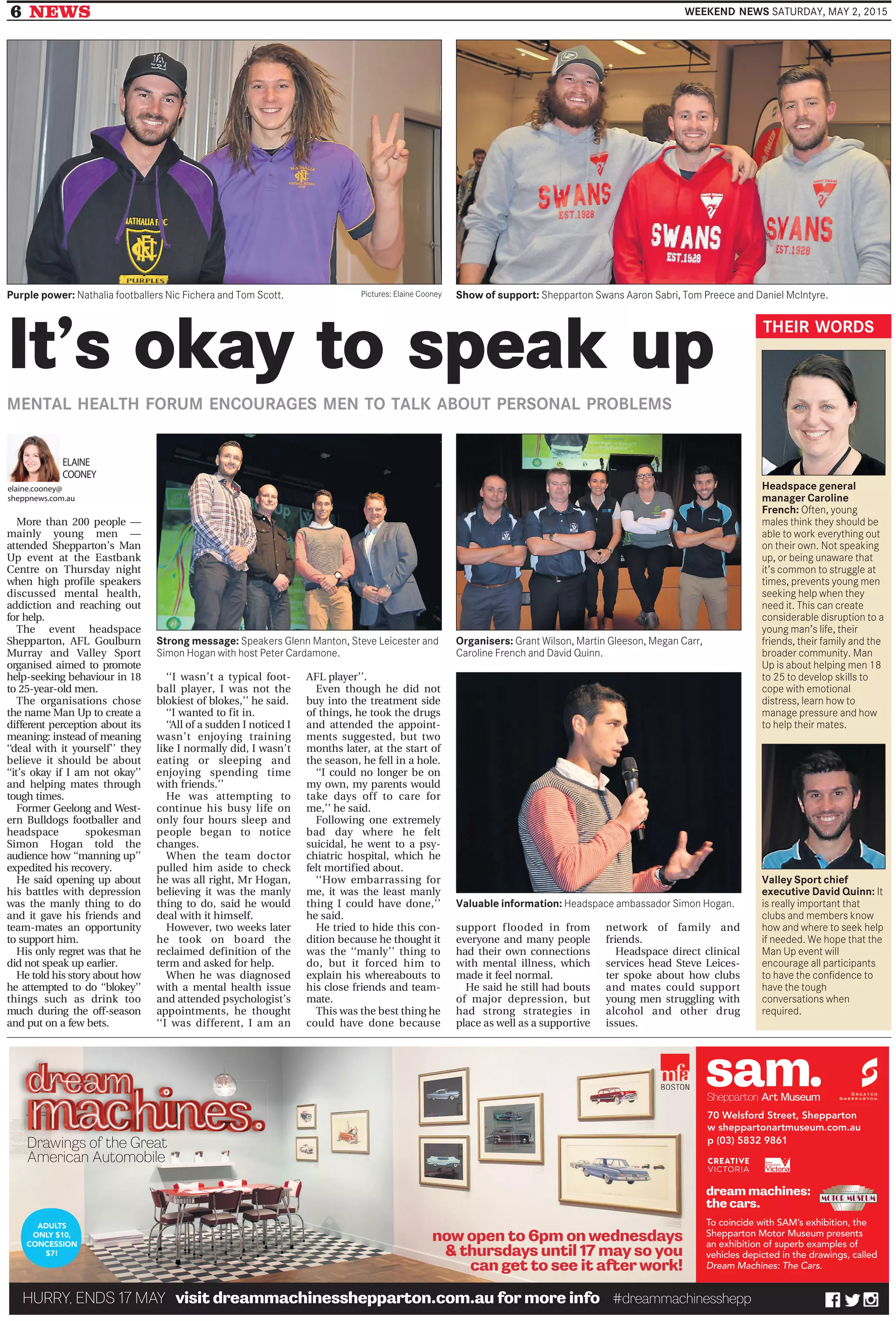 The document summarizes a Man Up event in Shepparton that aimed to promote help-seeking behavior in young men ages 18 to 25 for mental health issues. Over 200 people attended the event where former AFL player and Headspace spokesman Simon Hogan shared his experience battling depression and how opening up and seeking help expedited his recovery. The event was organized by Headspace Shepparton, AFL Goulburn Murray, and Valley Sport to encourage men that it is okay not to be okay and to help their friends who may be struggling.
