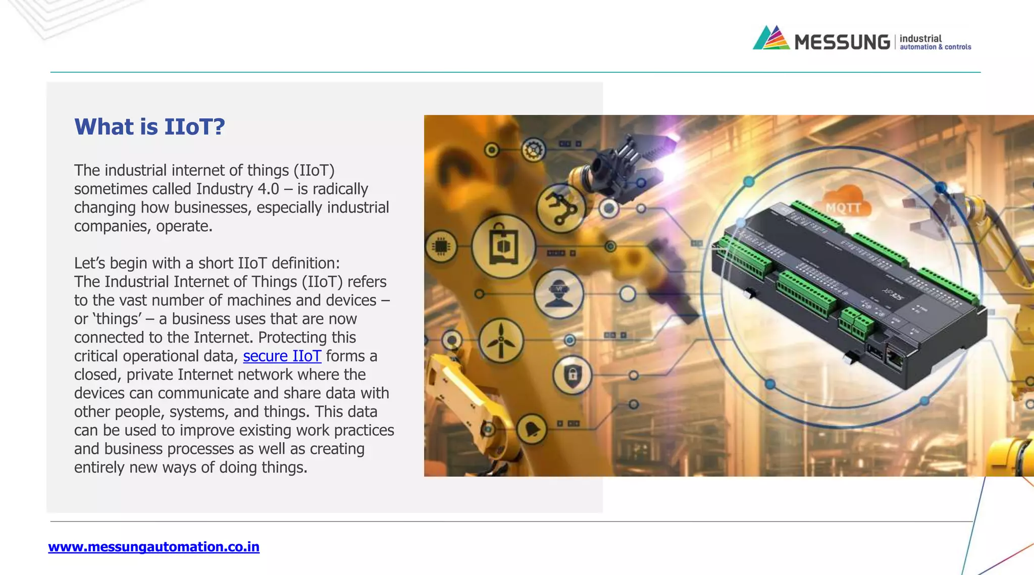 The document discusses the Industrial Internet of Things (IIoT) and its transformative impact on businesses, emphasizing benefits such as improved operational efficiency, increased productivity, cost reduction, and enhanced customer experience. It highlights the significance of MQTT (Message Queue Telemetry Transport) as a lightweight protocol supporting IIoT communication and outlines various challenges organizations face when implementing IIoT solutions, including security, data privacy, and standardization. Finally, it presents a case study showcasing how Messung's NX-Era PLCs utilize IIoT and MQTT to enhance automation and monitoring in production environments.