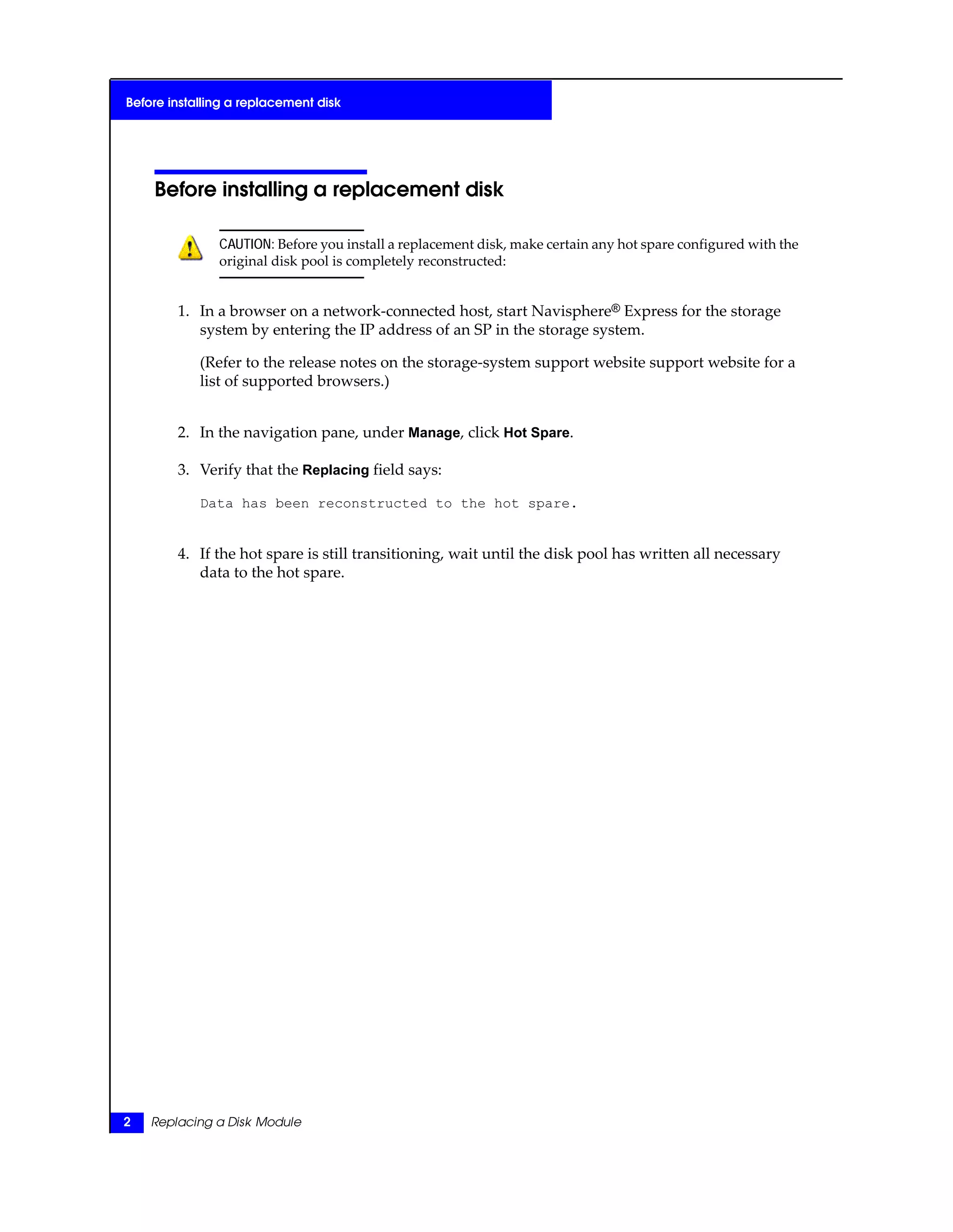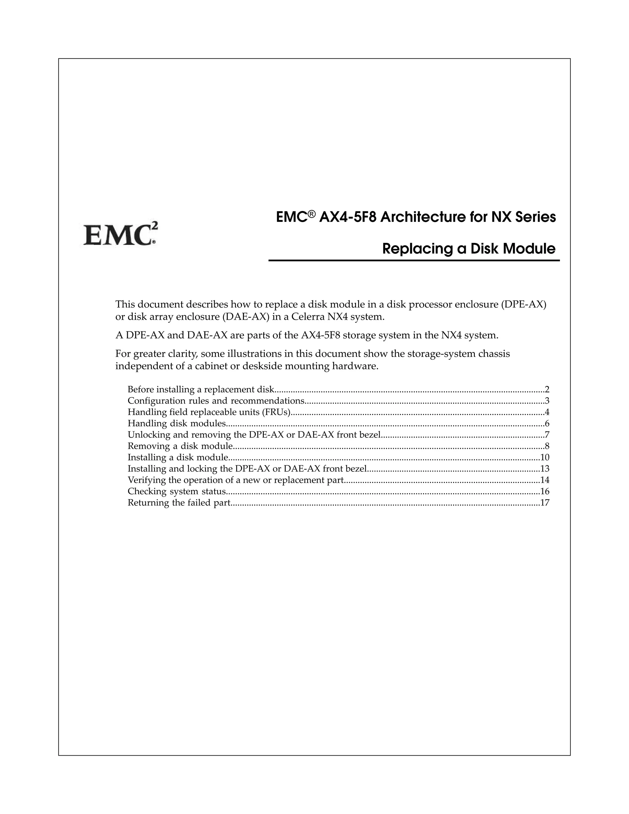 This document provides instructions for replacing a disk module in a Celerra NX4 storage system. It describes removing the front bezel of the disk processor enclosure or disk array enclosure, safely removing the faulty disk module, installing the replacement module, and reinstalling the front bezel. Guidelines are provided for handling field replaceable units and disk modules to prevent electrostatic discharge damage.