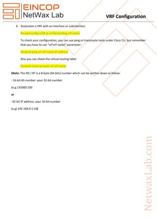 This document outlines the steps for basic VRF (Virtual Routing and Forwarding) configuration, including entering VRF mode, creating a route distinguisher, and associating routes with an interface. It provides example commands for setting up interfaces and VRFs on Cisco devices, along with instructions for verifying the configuration using ping and routing table checks. Additionally, it emphasizes maintaining consistent IP addresses across router interfaces while setting up VRFs.
