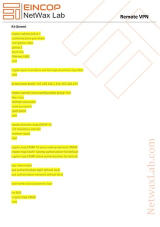 Remote VPNs allow secure access to corporate networks from remote locations by establishing an encrypted tunnel over the Internet. They provide secure communications and access rights tailored to individual users, enhancing productivity by extending corporate networks and applications while reducing costs and increasing flexibility. The example configuration shows a remote client (R1) connecting to a VPN server (R3) using IKE and IPsec to securely access resources on R3's network.