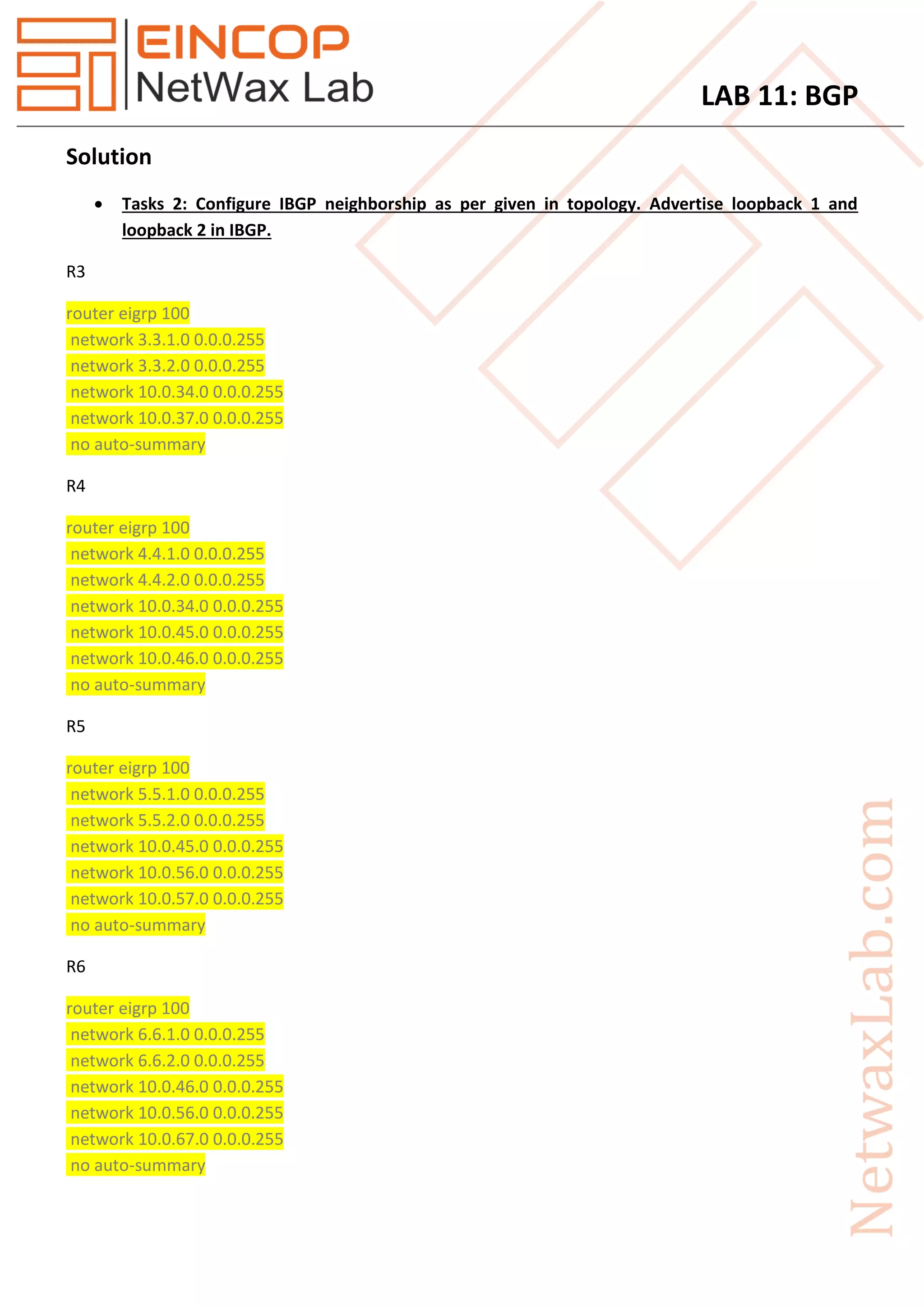 The document provides the configuration steps for a lab exercise on BGP. The steps include: