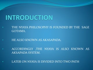 The Nyaya philosophy was founded by the sage Gautama and is also known as the Akshapada system. It accepts 16 categories of knowledge including perception, inference, comparison, and testimony. Perception is considered a valid source of knowledge and is defined as the contact between a sense organ and object. Perception is classified as ordinary and extraordinary, with ordinary perception occurring through the 5 senses and mind. Ordinary perception is further classified into indeterminate, determinate, and recognition. Inference is also accepted as a valid source of knowledge in Nyaya.