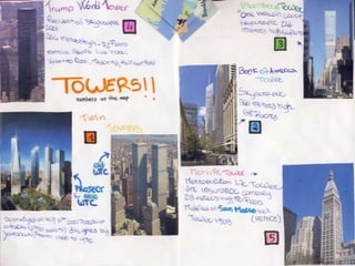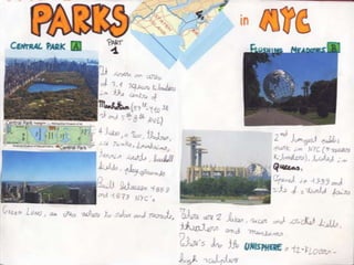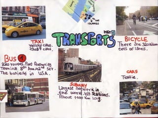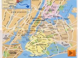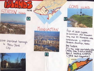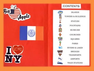 The document provides information about various islands, buildings, statues, museums, churches, squares, parks, bridges, transportation methods, and airports in and around New York City. It describes the key features and histories of over 50 locations and infrastructure elements that help define New York City's landscape and culture.