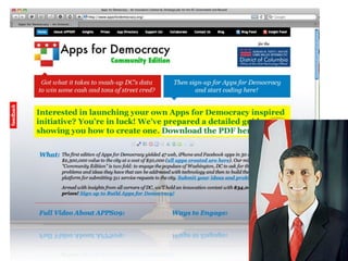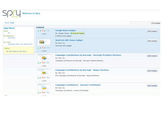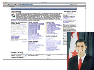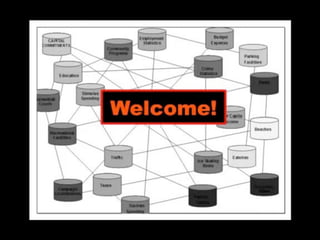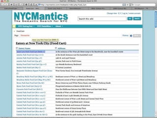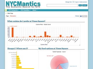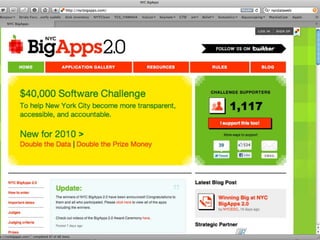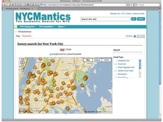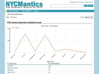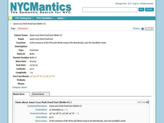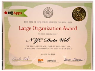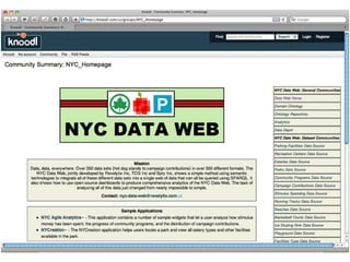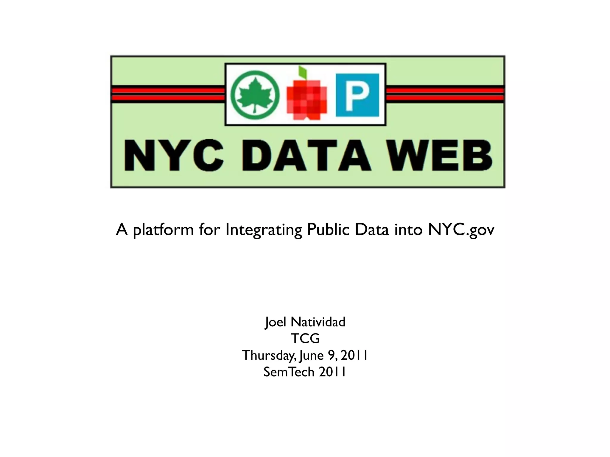 The document introduces NYC DataWeb, a platform for integrating public data into NYC.gov. It was created by TCG Software and Revelytix/Spry to make city data easier for developers, publishers and citizens to access and use. The platform hides complexity through semantic technologies and uses an ontology and query framework to provide unified access to siloed city data sources. Its goals are to stimulate app development, encourage innovation and make usable data available now.