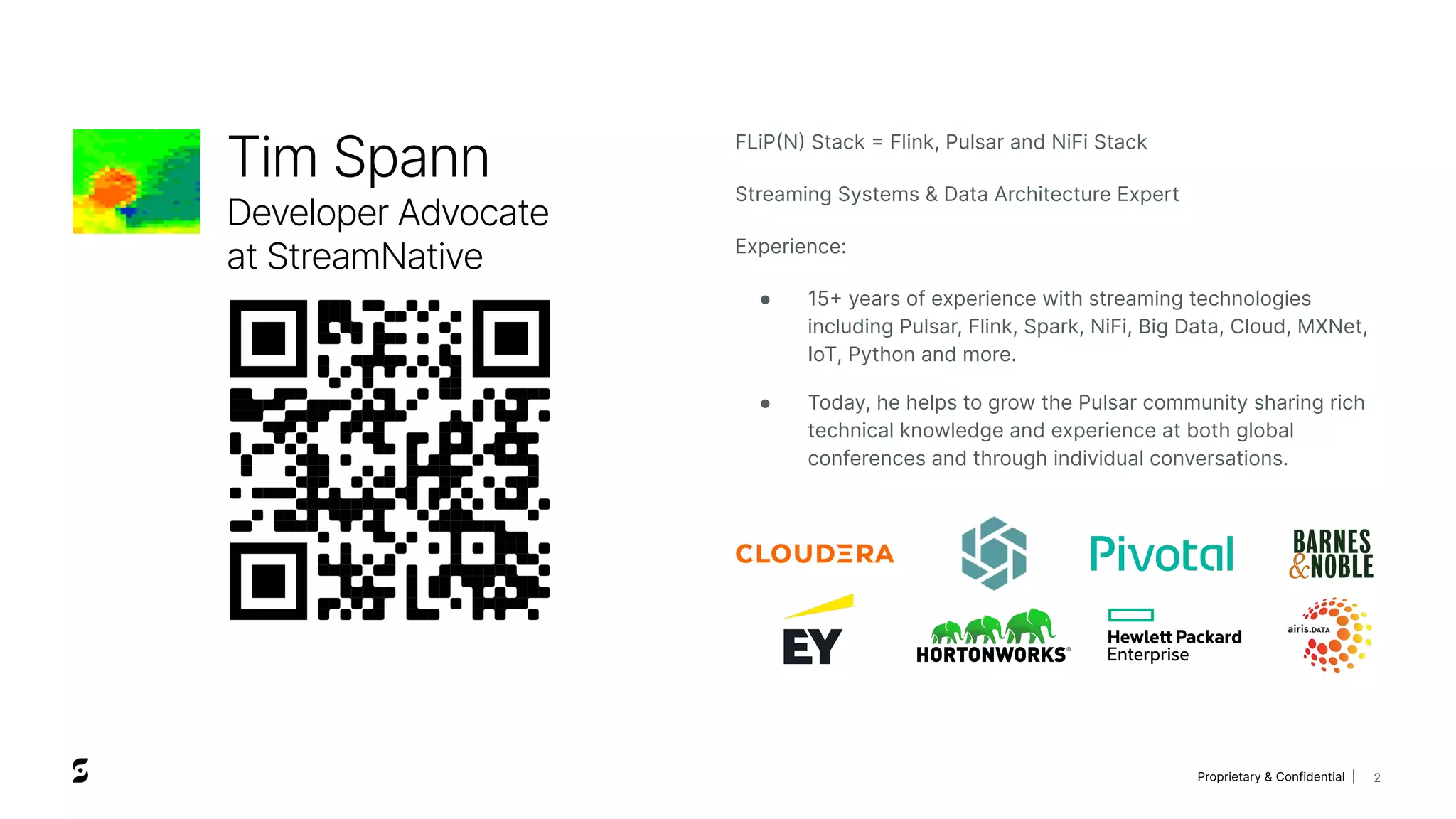 Tim Spann, a Developer Advocate at StreamNative, highlights his 15+ years of experience with streaming technologies, particularly focusing on Apache Pulsar, including its capabilities, community involvement, and multiple use cases across various industries. The document outlines the architecture of Pulsar, including messaging components, schema registration, and its integration with other technologies like Apache Flink and NiFi. Additionally, it provides insights into real-time applications in fields such as fintech, e-commerce, adtech, and IoT.