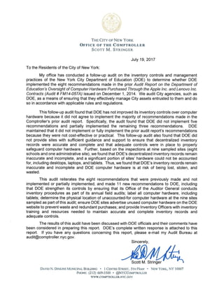 This audit report summarizes the findings of a follow-up audit to evaluate whether the New York City Department of Education (DOE) implemented recommendations from a prior 2014 audit related to inventory controls over computer hardware. The follow-up audit found that DOE did not improve its inventory controls and that its decentralized inventory records remained inaccurate and incomplete. Specifically, DOE could not account for 4,993 out of 14,329 pieces of computer hardware inspected at 9 sampled sites. The audit makes 19 recommendations for DOE to implement a centralized inventory system, conduct regular monitoring of site inventory records, determine locations of unaccounted hardware, and provide sites with training and resources to improve controls. In its response, DOE did not acknowledge the